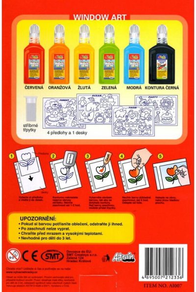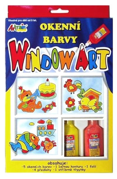 Sada 6 okenních barev se kterými si děti vytvoří ozdoby nejen na okna. Vyber si předlohu a vlož ji do desek. Pomocí černé konturové barvy překresli obrys, vzniklý obrázek vybarvi dle své fantazie a dozdob třpytkami. Obrázek nechej cca 6 hodin řádně zaschnout a je hotovo - teď můžeš vyrobený motiv nalepit třeba na okno. Vytvářet můžeš i bez předlohy a své obrázky můžeš lepit na nejrůznější skleněné nebo plastové povrchy. Balení obsahuje 6 barevných barev (červená, oranžová, žlutá, zelená, modrá a černá), folii pro překreslování, 4 předlohy s nejrůznějšími obrázky a lahvičku se stříbrnými třpytkami. Nevhodné pro děti do 3 let.