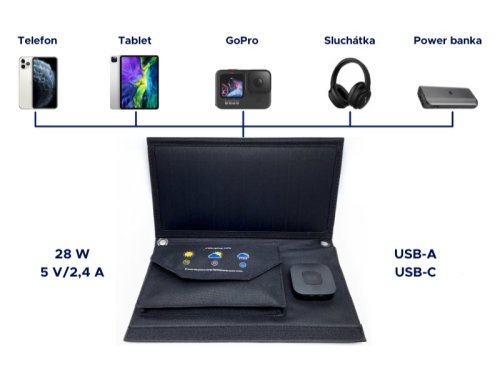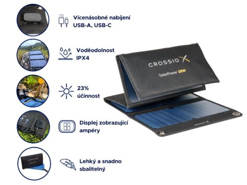 Solární panel CROSSIO SolarPower 28W využijete pro bezpečné dobíjení veškeré drobné elektroniky od mobilních telefonů a tabletů až po reproduktory a powerbanky. Možnost složení stejně jako jednoduché připnutí na stan či batoh z něj dělá spolehlivého parťáka na cesty i kempování. Díky větší kapacitě zvládne lépe nabíjet i 2 zařízení najednou.