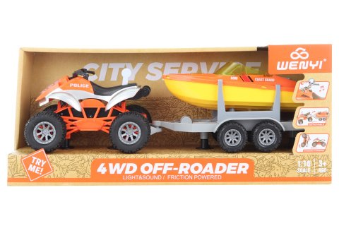 Plastová čtyřkolka s vlekem a člunem. Čtyřkolka vydává zvuky a svítí. Napájení na 3 AG13 baterie (jsou součástí balení). Rozměry balení cca 42 x 18,5 x 11,5 cm. Věk 3+