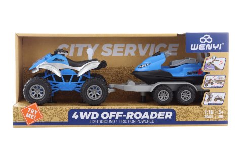 Plastová čtyřkolka s vlekem a skútrem. Čtyřkolka vydává zvuky a svítí. Napájení na 3 AG13 baterie (jsou součástí balení). Rozměry balení cca 42 x 18,5 x 11,5 cm. Věk 3+