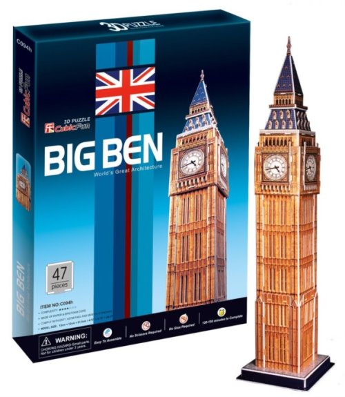 3D puzzle - stavebnice ze série Nejslavnější architektura světa (World's Great Architecture) od CubicFun vyrobená ze speciálního materiálu - asi 3mm silné pěny potažené laminovaným potištěným papírem. Sestavování 3D puzzle Cubicfun je zábavou pro celou rodinu. Hotové modely mohou být sběratelským a dekorativním doplňkem bytu nebo dětského pokoje. Dílky se k sobě sestavují pomocí návodu bez použití lepidla a nůžek - předražené dílky pouze jednoduše vylomíte z archu. Obtížnost 5 , 7 Orientační čas na sestavení: 120 - 150 minut Big Ben je hovorové označení používané pro hodinovou věž která je součástí budovy Westminsterského paláce vedle Temže v Londýně a neformální pojmenování Velkého zvonu. Věž se tyčí nad severovýchodní straně paláce, ve kterém zasedá parlament. Více na Wikipedii Rozměr složeného puzzle cca 12 x 12 x 51,5 cm