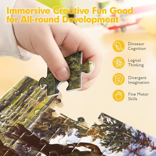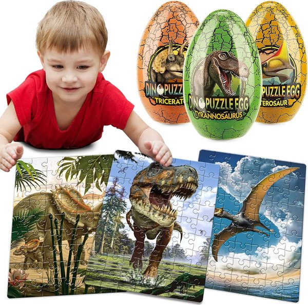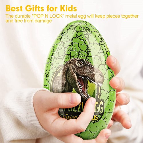Dvojitá zábava - na jedné straně puzzle ilustrace dinosaura, na druhé straně abstraktní vzor s dinosauřími fosiliemi odolné kovové vajíčko pro bezpečné uložení puzzle vyrobeno z pevného tvrzeného papíru, který se neroztrhne ani nezlomí potištěno netoxickými inkousty na sojové bázi perfektní velikonoční dárek, na párty, k narozeninám nebo k Vánocům