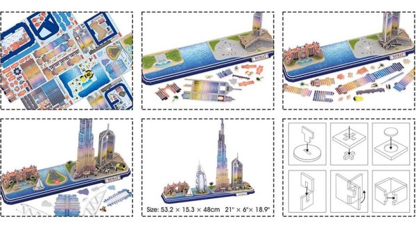 Okouzlující svítící 3D panorama Dubaje. 3D puzzle - stavebnice ze série CityLine od CubicFun vyrobená ze speciálního materiálu - asi 3mm silné pěny potažené laminovaným potištěným papírem.