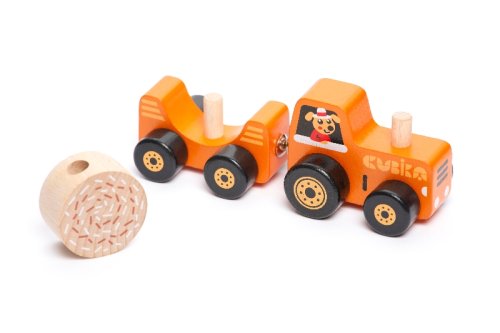 Traktor s vlekem je 3 dílná dřevěná skládačka s magnetem, který umožňuje snadné propojení jednotlivých dílků. Balík slámy na vleku je sundavací.