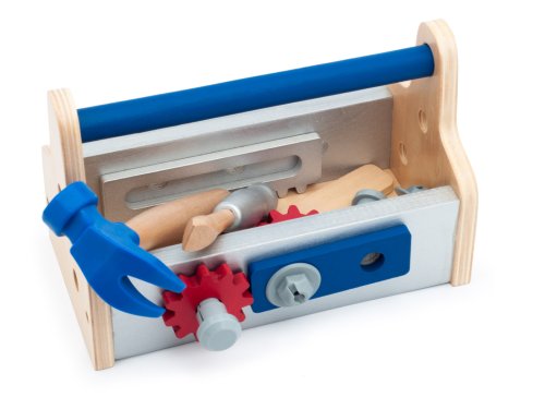 Obsahuje: Obsahuje 14 dílů - kladívko, šroubovák, pilku, klíč, děrovanou podložku pro zatloukání a šroubování, 2 kusy ozubených koleček, 2 kusy šroubků s matičkami, 2 plastové hřebíky, krabičku na uložení.