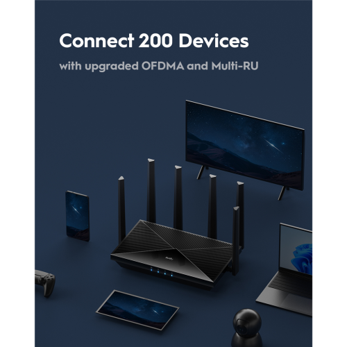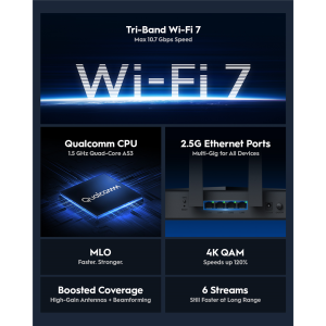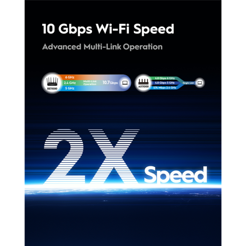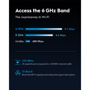 • podpora IEEE 802.11be (Wi-Fi 7) ve třech pásmech se 6 streamy a celkovou přenosovou rychlostí až 10700 Mb/s (5,7 Gb/s + 4,3 Gb/s + 688 Mb/s)