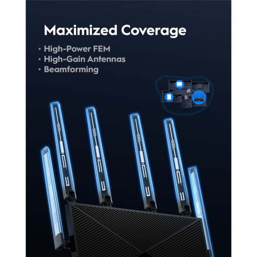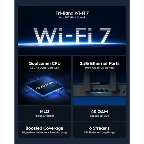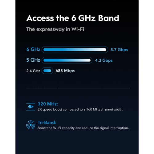 • třípásmový router pro pásma 2,4 GHz, 5 GHz a 6 GHz s šířkou kanálu až 320 MHz a 2,5G Ethernet porty