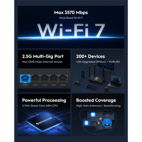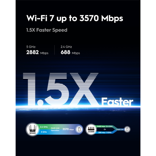 • podpora IEEE 802.11be (Wi-Fi 7) ve dvou pásmech s celkovou přenosovou rychlostí až 3570 Mb/s