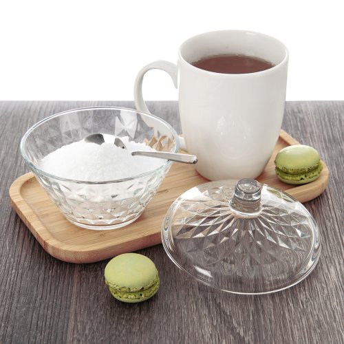Cukřenka s víčkem ze silnostěnného skla s plastickým dekorem. Lze mýt v myčce.