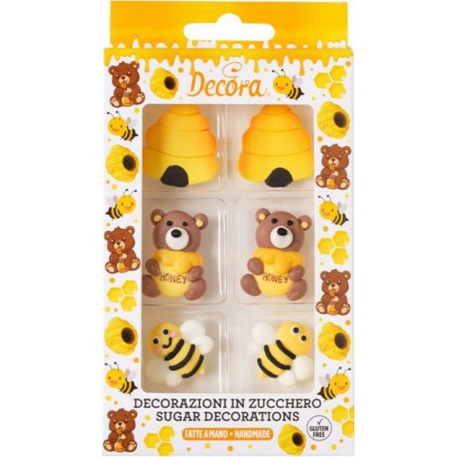 Roztomilé cukrové dekorace Decora – Med (6 ks) ve tvaru včeliček, medvídků a úlů. Ručně vyráběné, barevné, bez lepku – ideální na dorty, muffiny i sušenky.