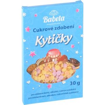 Cukrové zdobení ve tvaru kytiček na ozdobu dortů a zákusků, cukroví i pohárů.