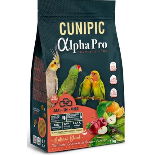 Složení: pšenice, kukuřice, mikronizovaná sója, pekařské výrobky, hrášek, rohovník, dehydrovaná ovocná dřeň (hruška, citrusy a jablko (5 %, zdroj fruktooligosacharidů/FOS)), hmyzí moučka (Tenebrio molitor, 3 %), semena kamélie (0,5 %), slunečnicový olej, inulin z agáve (0,5 %), olej z kamélie (0,5 %), inaktivované pivovarské kvasnice (0,1 %, zdroj mannan-oligosacharidů/MOS), uhličitan vápenatý a pšeničné klíčky. Analytické složky: hrubý protein 14 %, hrubý tuk 6,9 %, hrubá vláknina 3 % hrubý popel 4,9 %, vlhkost 10 %. Doplňkové látky na 1 kg: vitamín A (3a672a) 10 000 MJ, vitamín D3 (3a671) 1 050 MJ, vitamín E (alfa-tokoferol) (3a700) 30 mg, vitamín K3 (3a711) 2 mg, vitamín B1 (3a821) 2 mg, vitamín B2 (3a825iv) 5 mg, vitamín B5 (3a841) 11 mg, vitamín B6 (3a831) 4mg, vitamín B12 (3a835) 23 mg, železo Fe (3b102) 30 mg, jodičnan vápenatý (3b203) 1 mg, měď Cu (3b401) 3 mg, mangan Mn (3b504) 99,99 mg, seleničitan sodný (3b801) 0,1 mg, zinek Zn (3b601) 40 mg. Krmný návod: Podávejte dle potřeby papouška. V závislosti na druhu a stáří papouška se denní dávka krmiva může značně lišit. Doporučené složení denní dávky je 80 % krmiva Cunipic Alpha Pro a 20 % semen a ovoce.
