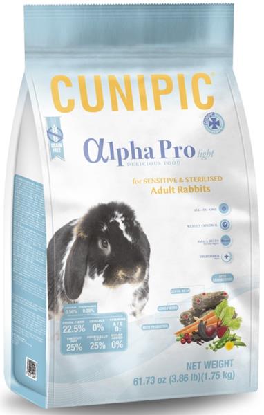 Bezobilné granule Cunipic Alpha Pro Light/Sensitive jsou určeny králíkům s citlivým trávením stejně jako sterilizovaným, starším i méně aktivním králíkům se sklony k nadváze a obezitě. Receptura je vhodná pro králíky všech plemen starší šesti měsíců a sestavena tak, aby jim zajistila co nejdelší a nejzdravější život. Hlavní výhody krmiva: