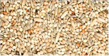 Lesklice kanárská, žluté proso, bílé proso, loupané proso, nahý oves, červené proso, grit z mořských mušlí, žaludeční kaménky, pomerančové aroma, vitamíny.