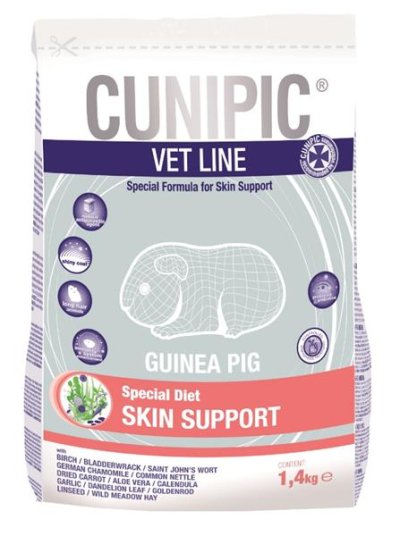 Kompletní vyvážené krmivo Skin support je doporučené pro onemocnění kůže a podkoží. Tato směs léčivých bylin pomáhá udržovat lesklou srst a zdravou kůži. Zlepšuje metabolické dráhy v těle zvířete a zlepšuje odolnost kůže vůči vnějším nepříznivým faktorům jako je zima, vlhko, horko... Indikace: atopická dermatitida, ichtyóza (šupinatost kůže), podpora funkcí kůže (dermatitida, ztráty chlupů), pyoderma (hnisavý zánět kůže), kožní tržné rány, vnější příznaky související s parazitickými onemocněními (svrab, blechy, klíšťata), pásový opar nebo jiné plísňové infekce kůže a podkoží, zánět vnějšího ucha, celoživotní péče pro druhy s dlouhou nebo zvláštní srstí (např. angora nebo plemena rex), línání srsti. Kontraindikace: březost, kojení, hyperlipidémie, zánět slinivky břišní nebo záněty prodělané v minulosti. Složení: Luční seno, pšeničná moučka, vojtěška (alfalfa), třezalka tečkovaná (Hypericum perforatum), ječmen, slunečnicová moučka, aloe vera (Aloe barbadensis), měsíček lékařský (Calendula officinalis), heřmánek pravý (Matricaria recutita), bříza (Betula pendula), chaluha bublinatá (Fucus vesiculosus), pampeliška lékařská list (Taraxacum officinalis), zlatobýl obecný (Solidago virgaurea), česnek (Allium sativum), kopřiva dvoudomá (Urtica dioica), přírodní prebiotika a probiotika, lněné semeno (Linum usitatissimum), sušená mrkev (Daucus carota). DOPLŇKOVÉ LÁTKY: NUTRIČNÍ DOPLŇKOVÉ LÁTKY/kg: Vitamín A 8.000 m.j., vitamín D3 1.000 m.j, vitamín C 100 mg, vitamín E 25 mg. Omega 3 a omega 6 mastné kyseliny. Analytické složky: Hrubý protein 12,1 %, hrubé oleje a tuky 2,4 %, hrubý popel 3,5 %, hrubá vláknina 17,6 %, vlhkost 11,75 %.