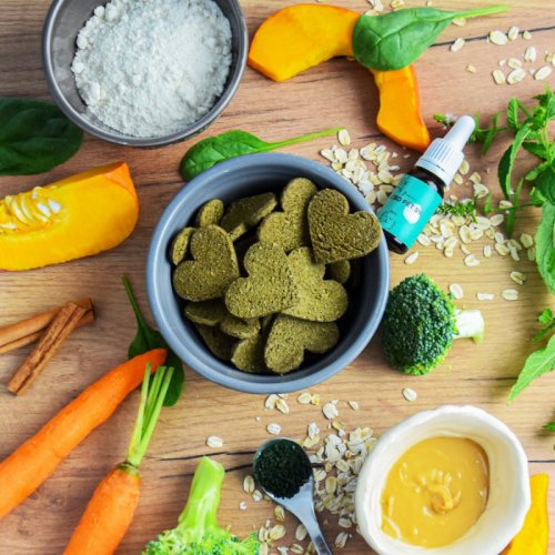 Složení: Brokolice, dýně, arašídové máslo, ovesné vločky, špenát, lněná mouka, rýžová mouka, skořice, za studena lisovaný mátový olej, spirulina/mořské řasy, CBD (75 mg), vitamín E (tokoferol), benzoan sodný.