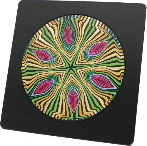 dva motivy v jednom puzzle = dvojnásobná výzva, neobvyklé tvary dílků, vysoce kvalitní dřevěné dílky, efekt zlatého lesku, dodáváno s rámečkem 235 x 235 mm.