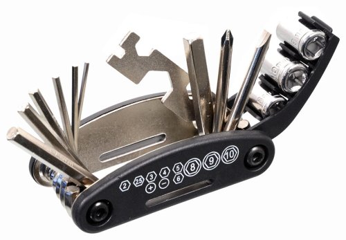 sada obsahuje: 1 x pouzdro na nářadí 4 x stranový klíč (8, 10, 15 mm + 14 GE) 6 x imbus klíč (2, 2.5, 3, 4, 5, 6 mm) 2 x šroubovák (křížový a plochý) 3 x nástrčný klíč (8, 9, 10 mm) 2 x montpáka pro výměnu duše 6 x záplata na duši 1 x lepidlo na duše 1 x brusný plíšek na duše