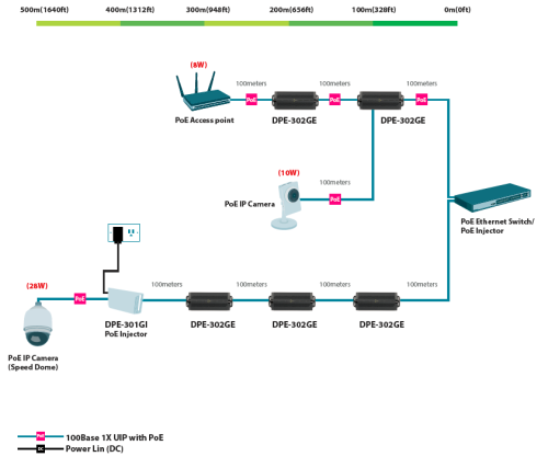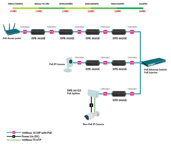 D-Link DPE-302GE je 2-portový Gigabit Ethernet IEEE 802.3af PoE / 802.3at PoE+ extender pro prodloužení dosahu Ethernet sítě a PoE napájení. Možnost řetězení až 4 jednotek za sebe, tzn. prodloužení dosahu až na vzdálenost 500m, při použití standardních UTP kabelů.