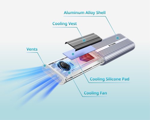 D-Link DSP-411 USB-C 4.0 Enclosure - externí box pro M.2 NVMe SSD Pouzdro (box, kryt) D-Link DSP-411 SSD poskytuje profesionálům a tvůrcům ultrarychlé přenosné úložiště s kapacitou až 8 TB. Díky podpoře USB4 nabízí vysokorychlostní přenos dat rychlostí až 40 Gb/s, což je ideální pro úpravy, zálohování a streamování v rozlišení 4K. S odolným hliníkovým designem, tichým chladicím ventilátorem MagLev a nastavením bez použití nářadí a dalšího softwaru je ideální na cesty napříč zařízeními Windows, macOS, Android a Linux, přičemž v jednom kompaktním krytu kombinuje rychlost, pohodlí a všestrannost. Díky podpoře SSD disků s kapacitou až 8 TB vám DSP-411 poskytuje dostatek prostoru pro velké soubory, mediální knihovny a zálohy, to vše v elegantním a přenosném provedení, které je navrženo pro produktivitu na cestách. DSP-411 je stvořen pro práci s vysoce výkonnými M Key NVMe PCIe M.2 SSD disky v různých provedeních (2230 / 2242 / 2260 / 2280), což vám dává svobodu výběru úložiště, které vyhovuje vašim potřebám. Díky bezproblémové kompatibilitě se zařízeními Windows 11/10, macOS, Linux a Android zajišťuje, že vaše data budou vždy dostupná, ať už upravujete data na pracovní stanici, přenášíte soubory na notebooku nebo rozšiřujete úložiště na cestách. Není třeba instalovat ovladače – zařízení je zcela plug and play a nevyžaduje externí napájení. DSP-411 je vybaven chladicím pláštěm, tichým chladicím ventilátorem MagLev, silikonovou tepelnou podložkou a pouzdrem z hliníkové slitiny, které vytvářejí vysoce efektivní strukturu pro odvod tepla. Ventilátor MagLev zajišťuje vysokorychlostní proudění vzduchu s menším počtem pohyblivých částí, což zajišťuje trvalý výkon a stabilitu. Udržováním vašeho SSD disku v chladu i při vysokém zatížení bez rušivého hluku se můžete soustředit na bezproblémové vytváření, přenos a ukládání souborů, ať už vás práce zavede kamkoli.