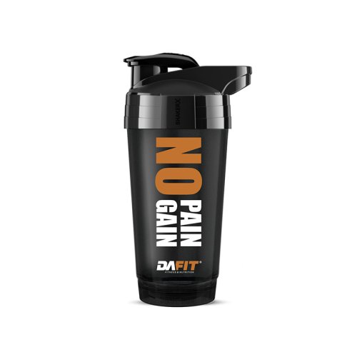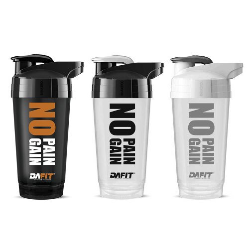 Šejkr Dafit NO PAIN NO GAIN s obsahem 700 ml. Černé nebo bílé provedení s nápisem NO PAIN NO GAIN. Šroubovací uzávěr zajišťující 100% nepropustnost. Zacvakávací malé horní víčko. Celkový obsah 700 ml, stupnice v rozsahu 100-600 ml. Praktické poutko pro nošení nebo připnutí.