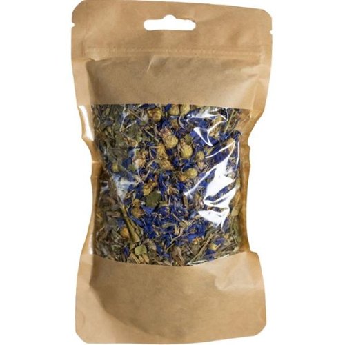 Sušená bylinná směs je vhodným doplňkem stravy pro králíky a hlodavce. Bylinky pocházejí z českých luk. Kvalitu každého balení zaručuje ruční plnění. Jahodníkové listy mají vysoký obsah vlákniny, která napomáhá trávení. List rybízu je známý svými léčivými účinky při chronických zánětech močových cest a infekčních zánětech dýchacích cest a také jako prostředek zvyšující látkovou výměnu při revmatických onemocněních. Působí pozitivně proti průjmu a lehce močopudně. Řebříček je vhodný při nachlazení a potížích s močovým měchýřem a ledvinami. Chrpa je velmi oblíbená přírodní pochoutka pro králíky i ostatní hlodavce. Působí protiinfekčně, detoxikačně, čistí játra a má pozitivní účinky při onemocněních močových cest. Složení: list jahodníku 30 %, list rybízu 30 %, řebříček květ 25 %, chrpa květ 15 %. Krmný návod: Přidávejte denně ke krmné dávce nebo volně jako pamlsek. Množství přizpůsobte druhu, věku a zdravotnímu stavu zvířete. Zvířeti zajistěte nepřetržitý přístup k čerstvé pitné vodě.