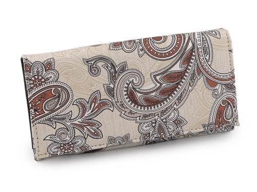 [Elegantní dámská peněženka má velice kvalitní provedení. Nadchne vás svým potahem s paisley motivem. Uvnitř má vynikající uspořádání se spoustou přihrádek a kapes.] Zapíná se na [klopu s patentem]. Uvnitř se nachází tři přihrádky na bankovky a jedna rozkládací kapsa s otvíráním na zip, sloužící k uschování mincí. Na vnitřních stranách peněženky pak najdete přihrádky k uložení karet či dokladů, [2 jsou průhledné].