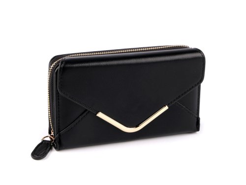 Dámská peněženka je velice elegantní, má tvar malého psaníčka. Přední klopa peněženky je ozdobená kovovým okrajem, peněženky se zapíná na patent. Uvnitř najdete 8 přihrádek na kreditní karty, z toho 1 má průhledné okýnko. Je zde umístěná i přihrádka na bankovky. Kapsu na mince najdete na boku peněženky, zapíná se na zip, je rozdělená přepážkou na dva oddíly.