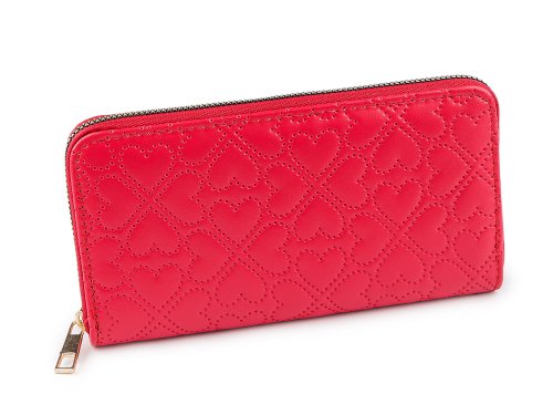Dámská peněženka s motivem srdíček je elegantním a stylovým doplňkem, který upoutá pozornost. Peněženka obsahuje jednu hlavní kapsu, která se zapíná na kovový zip. Uvnitř je peněženka členěná do tří velkých přihrádek na papírové bankovky a jedné uzavíratelné kapsy na zip, vhodné k ukládání mincí a různých drobností. Po vnitřních stranách peněženky jsou přihrádky na karty a dvě větší na doklady, účtenky apod.