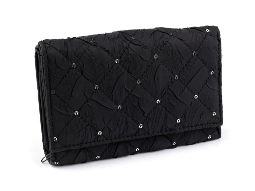 Dámská prošívaná peněženka s flitry má velice poutavý design. Textilní potah je příjemný na dotek. Nadchne vás svým vnitřním uspořádáním se spoustou přihrádek a kapes. Zavírá se na klopu a patent. Uvnitř jsou 2 oddělené prostory. Po pravé straně jsou 4 přihrádky na karty, z toho je 1 průhledná. Pod nimi je 1 velká plochá kapsa. Uprostřed peněženky se nachází 2 kapsy na bankovky, v jedné je malá kapsička na zip. Vlevo je mincovník, který se zapíná na zip. Peněženka ukrývá ještě druhý oddíl, který se objeví po odepnutí zápinky na levé straně. Zde se nachází 6 přihrádek na kreditní karty a 5 plochých kapes.