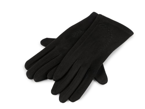 Elegantní dámské rukavice jsou na vrchní části ozdobené výšivkou větvičky. Výborně pruží, díky tomu se perfektně natahují. Materiál je velice příjemný na dotek, připomíná semiš, uvnitř mají rukavičky jemný plyš. Hodí se do mírné zimy nebo do chladnějšího podzimního počasí. Na ukazováčku pravé i levé ruky je vyšitý květ, díky kterému můžete ovládat dotykové přístroje - mobil, tablet, bankomat apod. Tyto rukavice vám poskytnou styl a pohodlí na každý den. Šířka je měřená na volně položených rukavicích uprostřed (bez palce).