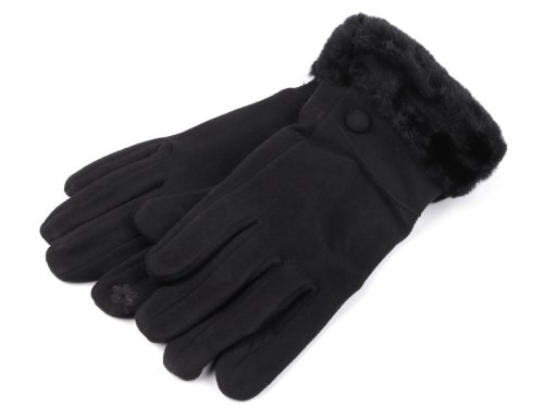 Elegantní dámské rukavice zdobí kožešinový lem a malý knoflík. Rukavice jsou jemně pružné. Povrch rukavic připomíná broušenou kůži. Uvnitř mají jemný plyš, jenž je velice příjemný na dotek. Hodí se do mírné zimy nebo do chladnějšího podzimního počasí. Na ukazováčku pravé i levé ruky je vyšitý květ, díky kterému můžete ovládat dotykové přístroje - mobil, tablet, bankomat apod. Šířka je měřená na volně položených rukavicích uprostřed (bez palce).