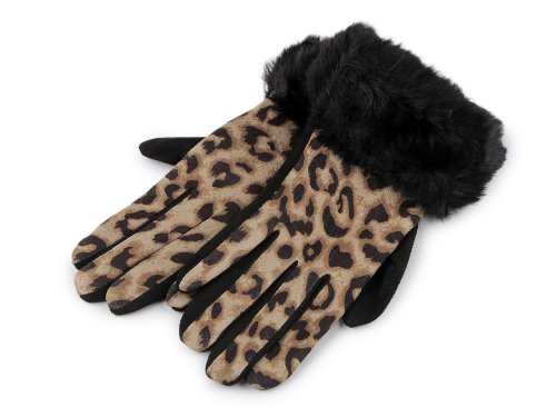 Elegantní dámské rukavice zdobí tygří vzor a kožešinový lem. Rukavice jsou jemně pružné. Povrch rukavic připomíná semiš. Uvnitř mají jemný plyš, jenž je velice příjemný na dotek. Hodí se do mírné zimy nebo do chladnějšího podzimního počasí. Na ukazováčku pravé i levé ruky je vyšitý květ, díky kterému můžete ovládat dotykové přístroje - mobil, tablet, bankomat apod. Šířka je měřená na volně položených rukavicích uprostřed (bez palce).