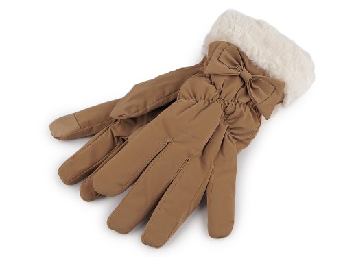 Elegantní šusťákové rukavice jsou ozdobené mašlí a lemem z umělé kožešiny.