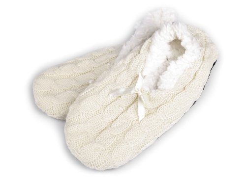 Dámské balerínky jsou skvělé jako domácí obuv. [Z vrchní strany je pletenina s copánkovým vzorem, uvnitř je teplá chlupatá podšívka, která věrně imituje vlnu.] Protiskluzové gumové tečky na chodidle zabrání uklouznutí. Upozorňujeme zákazníky, že složení na štítcích se může lišit, materiál je akryl, polyamid a polyester.