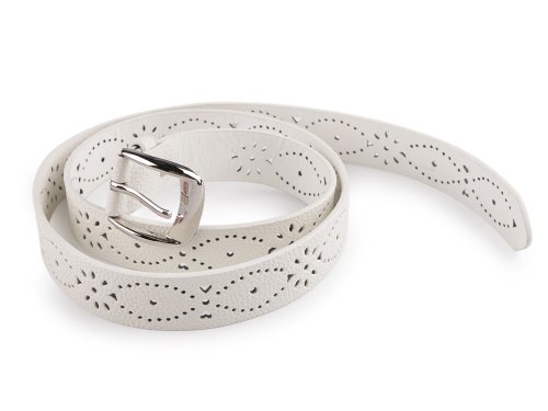 Dámský pásek s ozdobnou perforací po celé délce se řadí k nadčasovým modelům. Je vyrobený z eko kůže, dá se dobře kombinovat se širokou škálou oděvů. Zkombinujete ho s různorodými styly, od ležérního až po formální. Mohou jej nosit i dívky, protože obvod pásku si lehce přizpůsobí svému pasu. Má klasickou kovovou sponu na zapnutí. Maximální obvod zapnutí je 104 cm. Pásek se dá zkrátit na potřebnou délku díky šroubku, který je umístěný za sponou. Pásek č. 4 - červený je pololesklý.