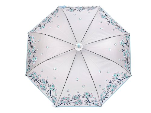 Průsvitný deštník s barevným potiskem bude slušet dívkám i ženám. Deštník je vystřelovací, konstrukci má z kovového drátu a pružných lamel, tvoří osm polí. Díky nim je velice pevný, neohne se ani za největšího nečasu. Klasická tyč je zakončená pevnou rukojetí. Hloubka deštníku je 27 cm.