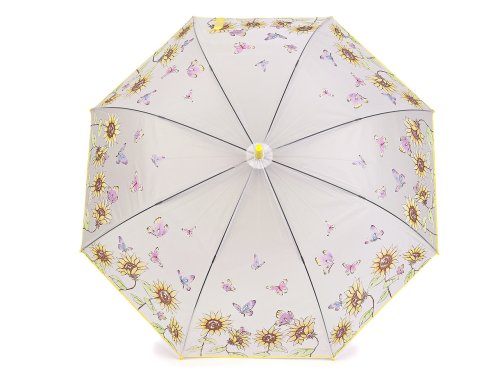 Průsvitný deštník s barevným potiskem bude slušet dívkám i ženám. Deštník je vystřelovací, konstrukci má z kovového drátu a pružných lamel, tvoří osm polí. Díky nim je velice pevný, neohne se ani za největšího nečasu. Klasická tyč je zakončená pevnou rukojetí. Hloubka deštníku je 27 cm.