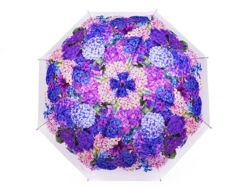 Průsvitný deštník s potiskem hortenzií je vystřelovací, konstrukci má z kovového drátu a pružných lamel, které tvoří osm polí. Díky nim je velice pevný, neohne se ani za největšího nečasu. Klasická tyč je zakončená pevnou rukojetí. Hloubka deštníku je 26 cm.