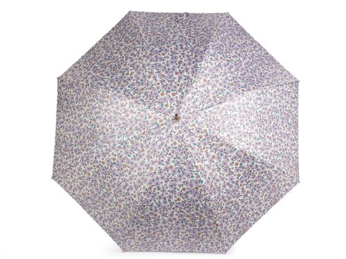Velký dámský deštník s potiskem květů je vystřelovací, konstrukci má z kovového drátu a pružných lamel, které tvoří osm polí. Díky nim je velice pevný, neohne se ani za největšího nečasu. UV filtr vás ochrání před slunečním zářením. Klasická tyč je zakončená pevnou rukojetí z eko kůže. Dolní strana potahu je černá. Hloubka deštníku je 24 cm.