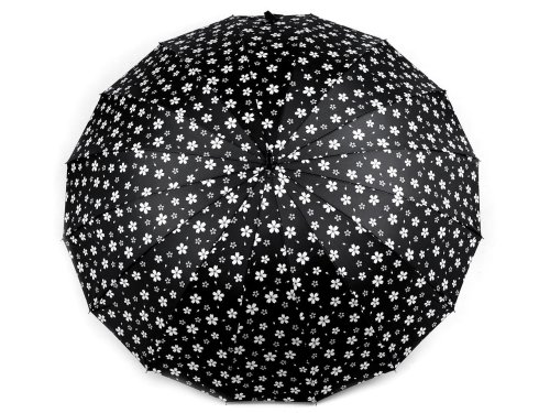 Dámský vystřelovací deštník s malými květy vás spolehlivě ochrání před nepřízní počasí. Skládá se z 16 výsečí, díky kterým se deštník řadí mezi luxusní kousky. Konstrukce je vyrobená z kovových drátů a pružných lamel zajišťujících vysokou pevnost a stabilitu, deštník se neohne ani za největšího nečasu. Má klasickou tyč zakončenou pevnou rukojetí. Hloubka deštníku je 26 cm.