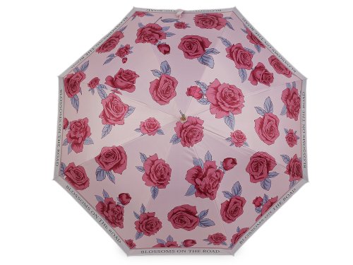 Velký dámský deštník s květinovým motivem je stylovým a praktickým doplňkem pro každou ženu. Díky svému atraktivnímu designu s květy, dodá šarm i těm nejzamračenějším dnům. Je vystřelovací, konstrukci má z kovového drátu a pružných lamel, které tvoří osm polí. Díky nim je velice pevný, neohne se ani za největšího nečasu. UV filtr vás ochrání před slunečním zářením. Klasická tyč je zakončená pevnou rukojetí z eko kůže. Dolní strana potahu je černá. Hloubka deštníku je 24 cm.