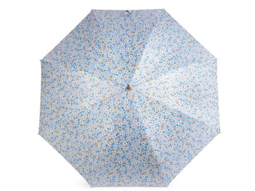 Velký dámský deštník s potiskem květů je vystřelovací, konstrukci má z kovového drátu a pružných lamel, které tvoří osm polí. Díky nim je velice pevný, neohne se ani za největšího nečasu. UV filtr vás ochrání před slunečním zářením. Klasická tyč je zakončená pevnou rukojetí z eko kůže. Dolní strana potahu je černá. Hloubka deštníku je 24 cm.