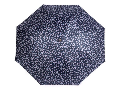 Velký dámský deštník s potiskem malých květů je vystřelovací, konstrukci má z kovového drátu a pružných lamel, které tvoří osm polí. Díky nim je velice pevný, neohne se ani za největšího nečasu. UV filtr vás ochrání před slunečním zářením. Klasická tyč je zakončená pevnou rukojetí z eko kůže. Dolní strana potahu je černá. Hloubka deštníku je 24 cm.