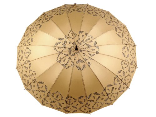 Dámský vystřelovací deštník s jemným vzorem větviček a květů vás spolehlivě ochrání před nepřízní počasí. Skládá se z 16 výsečí, díky kterým se deštník řadí mezi luxusní kousky. Konstrukce je vyrobená z kovových drátů a pružných lamel zajišťujících vysokou pevnost a stabilitu, deštník se neohne ani za největšího nečasu. Má klasickou tyč zakončenou pevnou rukojetí. Hloubka deštníku je 27 cm.