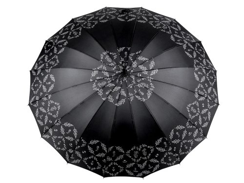 Dámský vystřelovací deštník s jemným vzorem větviček a květů vás spolehlivě ochrání před nepřízní počasí. Skládá se z 16 výsečí, díky kterým se deštník řadí mezi luxusní kousky. Konstrukce je vyrobená z kovových drátů a pružných lamel zajišťujících vysokou pevnost a stabilitu, deštník se neohne ani za největšího nečasu. Má klasickou tyč zakončenou pevnou rukojetí. Hloubka deštníku je 27 cm.