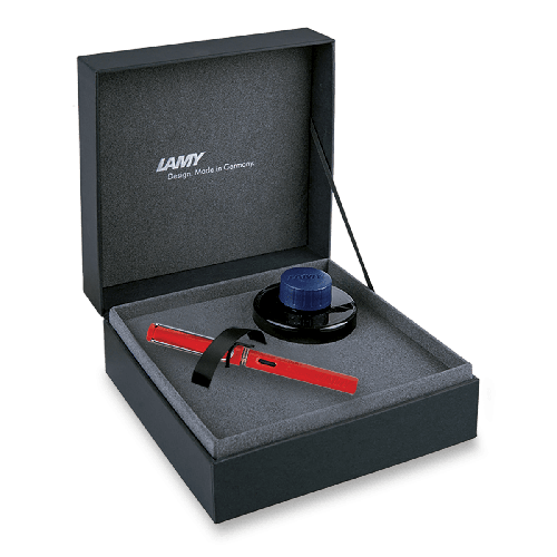 Dárková kazeta obsahuje:, * plnicí pero LAMY Safari Shiny Red, * modročerný lahvičkový inkoust LAMY T 52, * voucher Akademie psaní