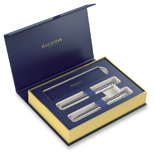 Dárková kazeta obsahuje:, * plnicí pero Waterman Allure Chrome CT, * kuličkové pero Waterman Allure Chrome CT, * voucher Akademie psaní