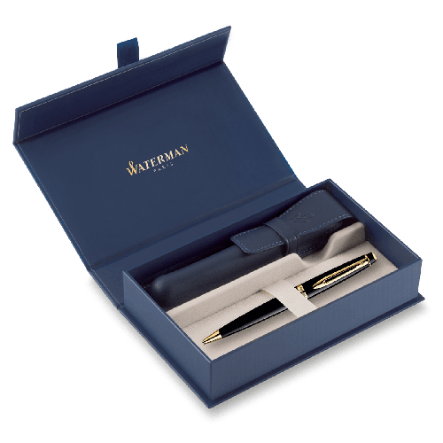 Dárková kazeta obsahuje:, * kuličkové pero Waterman Expert Black GT, * modré kožené pouzdro Waterman, * voucher Akademie psaní