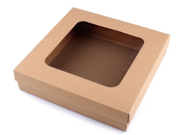 Čtvercová papírová krabice má výřez ve víku z průhledné fólie. Využijete ji na balení dárků, šátků, uložení baněk apod. Můžete si ji i dozdobit podle svého vkusu. Krabici dodáváme v rozloženém stavu (horní víko - 47 x 47 cm, spodní část krabice - 60 x 60 cm). Složíte si ji jednoduše podle vyznačených ohýbacích krajů. Rozměr průhledu je 20 x 20 cm. [Připravili jsme pro vás foto návod na skládání krabičky.]